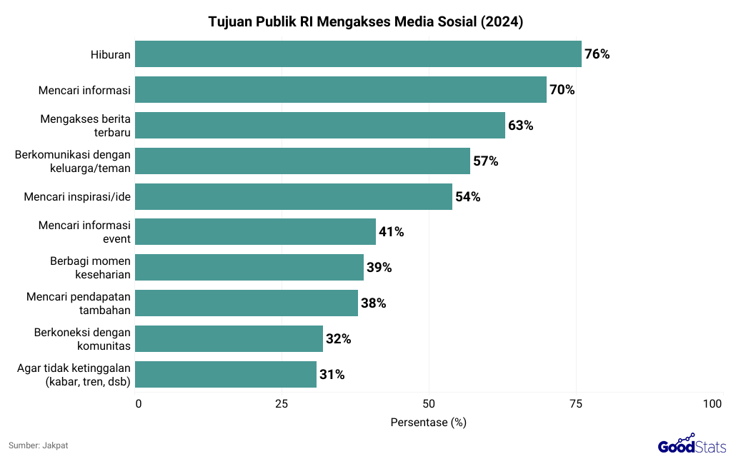 Terpisah, hasil survei Jakpat pada paruh kedua tahun lalu mengungkap bahwa mayoritas publik mengakses medsos untuk hiburan, mencari informasi hingga berita terbaru.